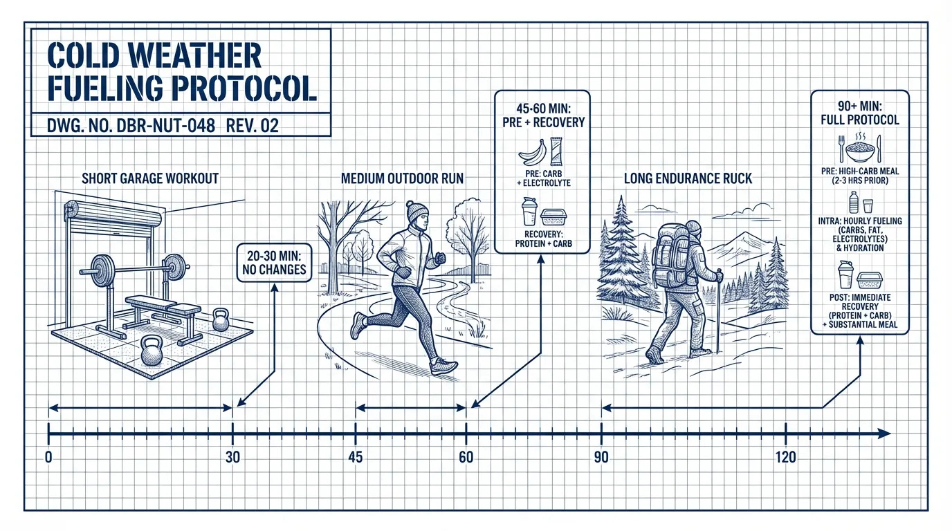 The specific pre/during/post fueling strategies for cold weather workouts—scaled by duration, intensity, and when you don’t need to change anything at all.