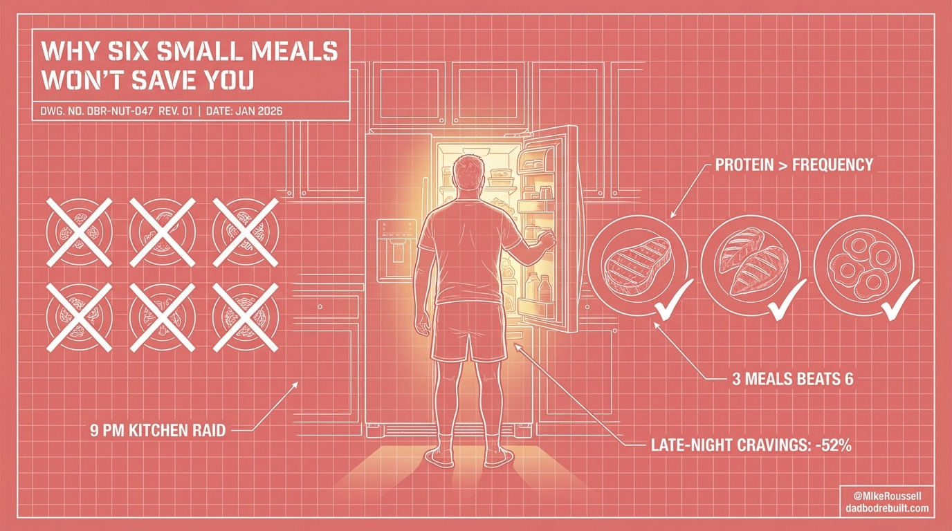 The fix isn’t eating more often. It’s eating more protein at the meals you already have. Aim for 30+ grams at breakfast, lunch, and dinner. Three solid meals beat six small ones—especially when those meals are anchored by real protein.