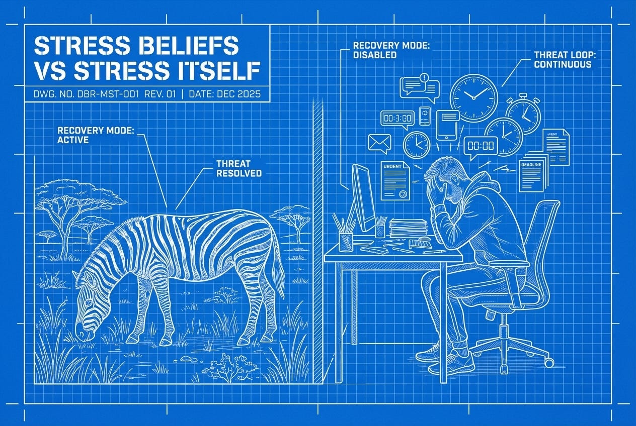 This is chronic stress. This is what happens when your stress response keeps firing without adequate recovery. The same biology that saves the zebra’s life becomes the biology that destroys yours.